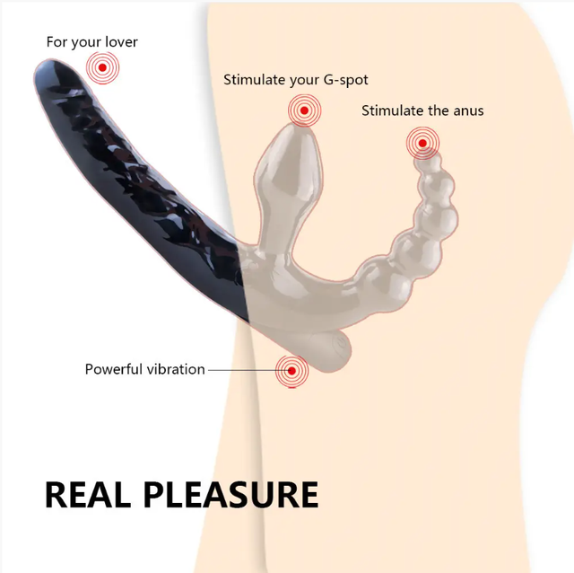 Іграшку називають безремневий страпон для потрійної стимуляції. Він чудово фіксується без допомоги додаткових ременів. Його можна використовувати для мастурбації, двом дівчатам для розваг, парам для додаткової стимуляції.